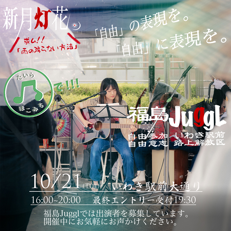 「福島JuggL」はストリートオープンマイクです。弾き語り・オケ・ダンス・大道芸などなど、表現したい人は誰でも参加自由!飛び入り参加も大歓迎!
