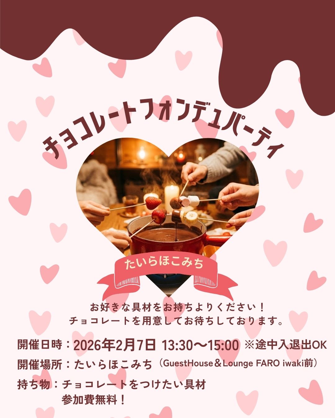 溶かした温かいチョコレートに、好きな具材をくぐらせてパクり。 みんなでワイワイおしゃべりしながらバレンタインを楽しみませんか?