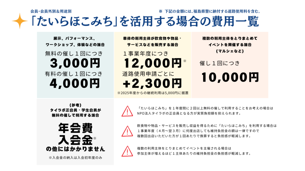 ※ 「ほこみち維持負担金」は、「たいらほこみち」エリア内に設置したストリートファニチャーや人工芝などの維持補修その他「たいらほこみち」を安心・安全にお使いいただくための取り組みに充てるほか、道路を占用し「たいらほこみち」とするため福島県に対し納付する占用料及び福島県警察本部に対し納付する道路使用料などに充てるものです。皆様のご協力をお願い申し上げます。